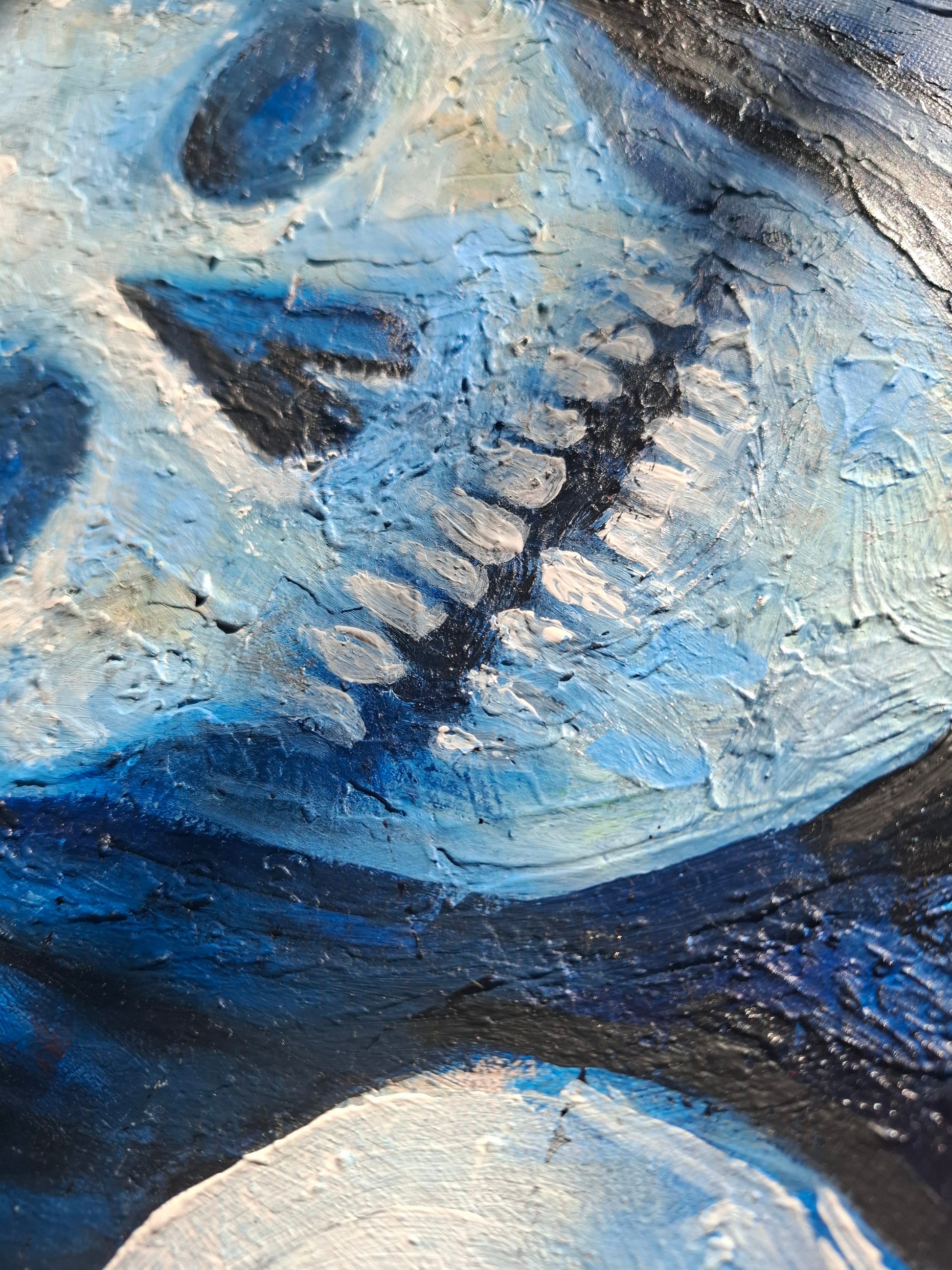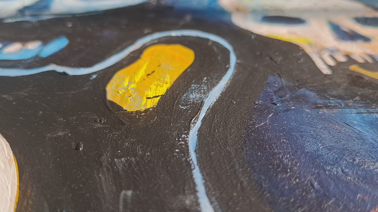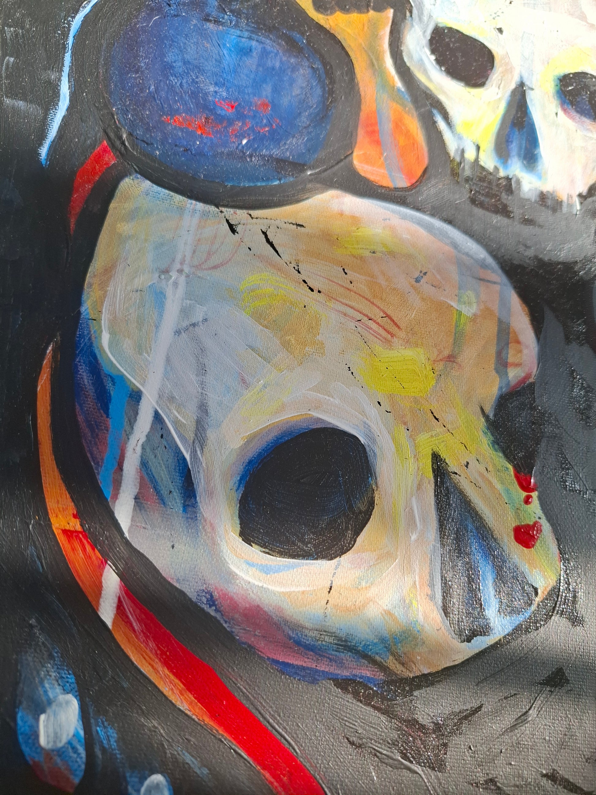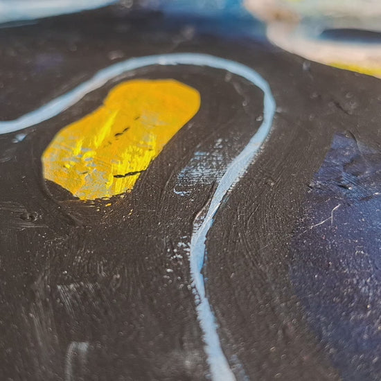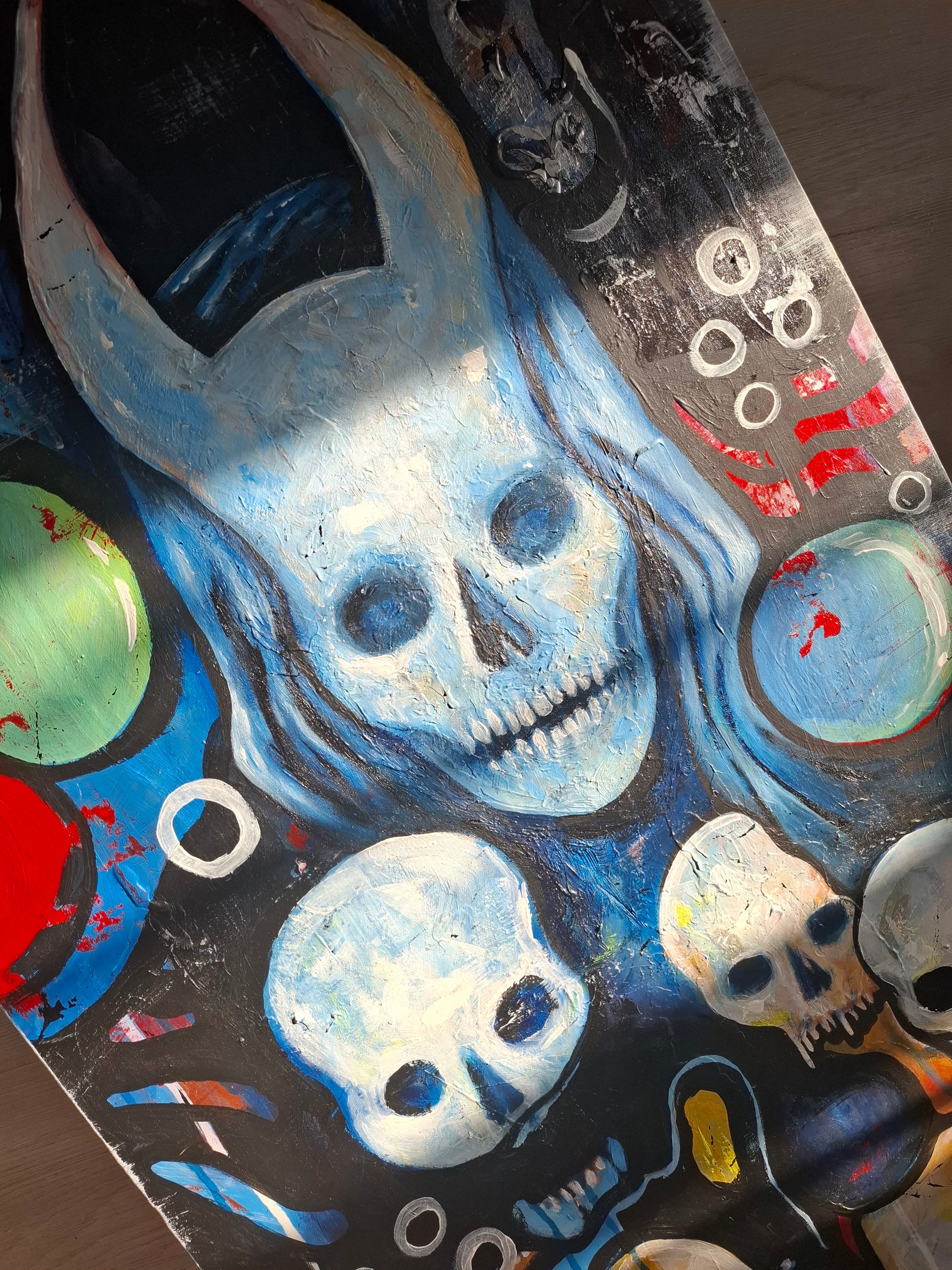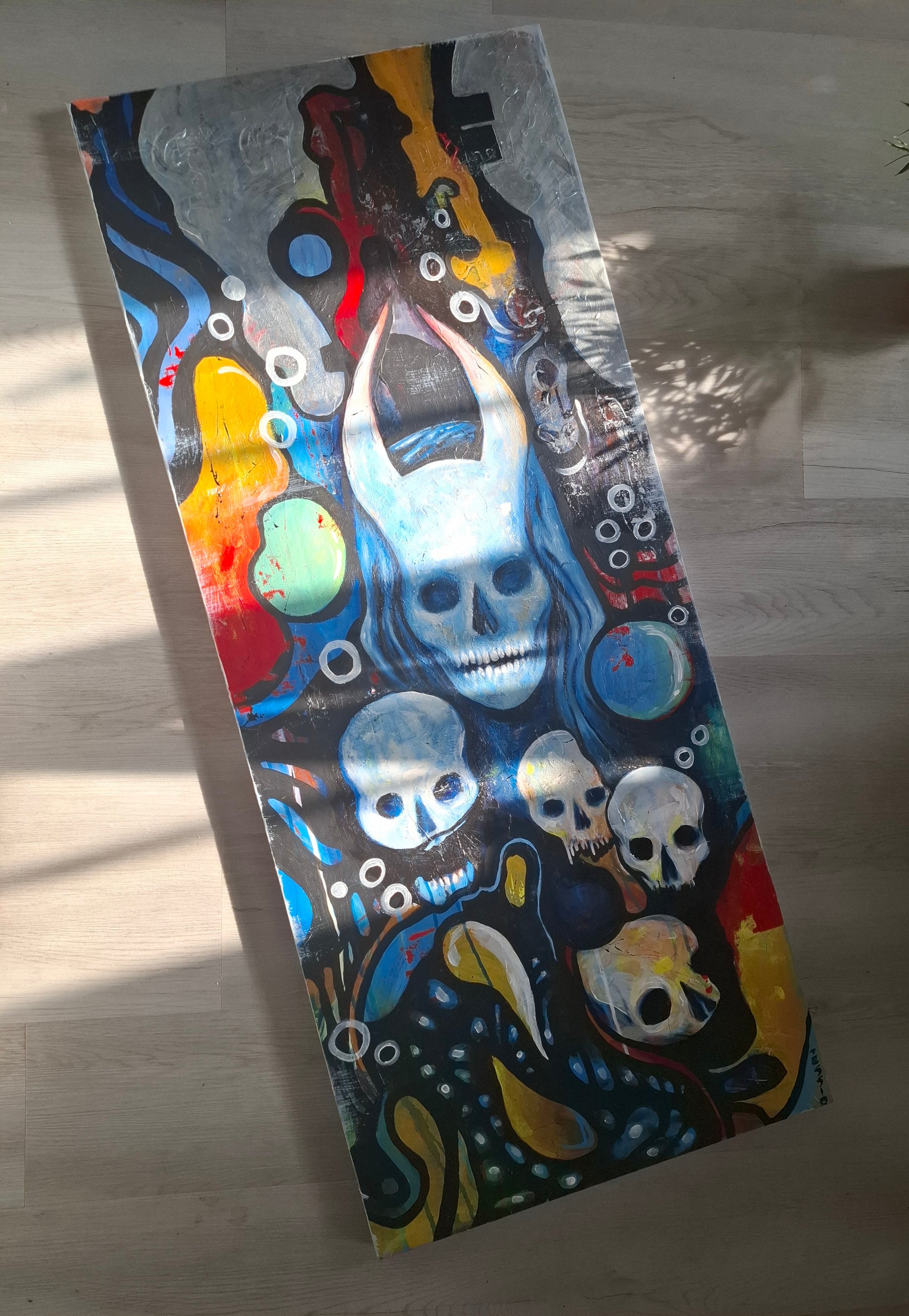 DISCO DEMONS- A creative psychedelic acrylic painting on Upcycled canvas. This larger, more vibrant piece uses pattern work and abstract surrealism to create a colourful, chaotic scene. It's a head turner for sure, but it's the perfect accent on a white wall!